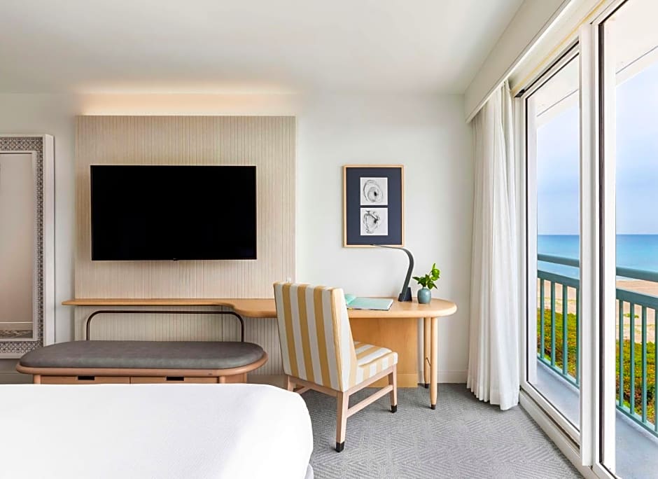 This room features a balcony with an ocean view and a seating area with a sofa bed. A desk is also included.